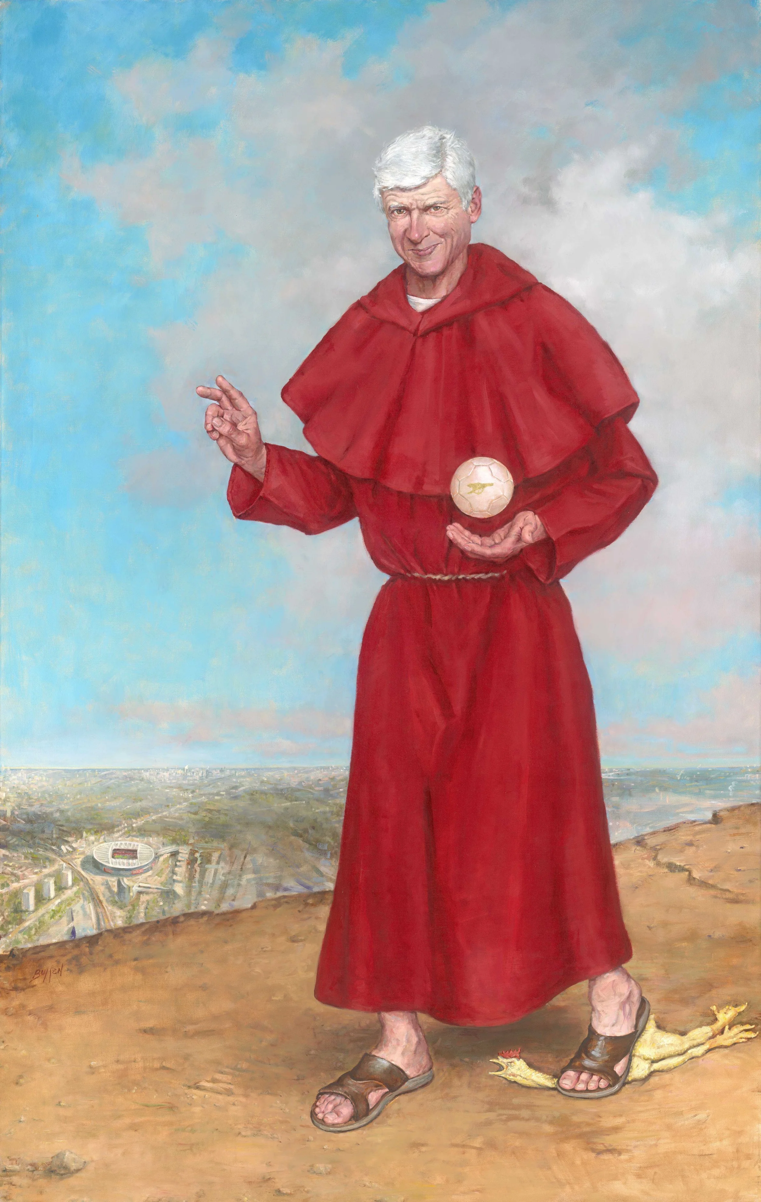 Arsene Wenger is St. Totteringham in American artist Mark Bullen's life-size painting, St. Totteringham's Day. The day when their hapless North London neighbors can no longer go above them in the Premier League table. High above the Arsenal stadium, our benevolent saint with his knowing smile strides forward, unconcerned with what is underfoot as he brings joy to the gunner faithful worldwide. Yes it's good to be a gooner on St.Totteringham's Day!